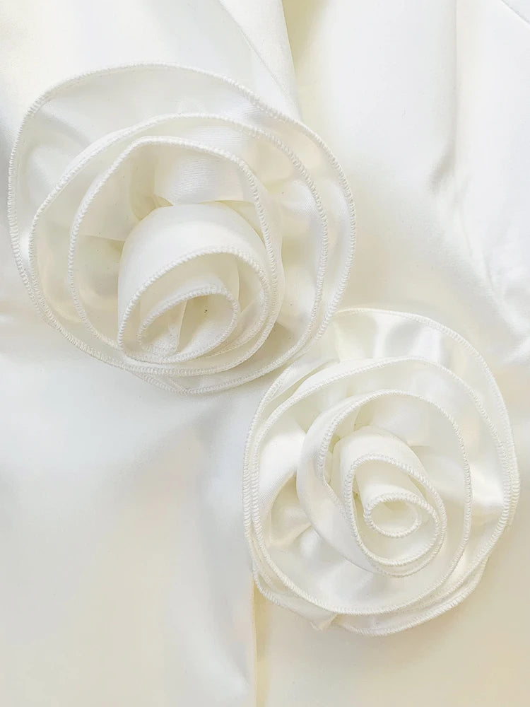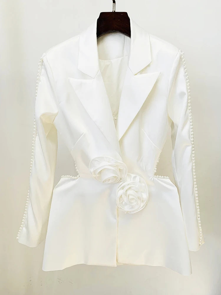 O Conjunto Bianca Pearl traduz delicadeza com presença. A blazer slim com botões únicos ganha protagonismo através de pérolas aplicadas manualmente e da flor estruturada que nasce na cintura como uma escultura — símbolo de feminilidade em estado puro. A calça flare em gaze translúcida cria movimento e leveza, formando uma composição que mescla força e sutileza em perfeita harmonia.