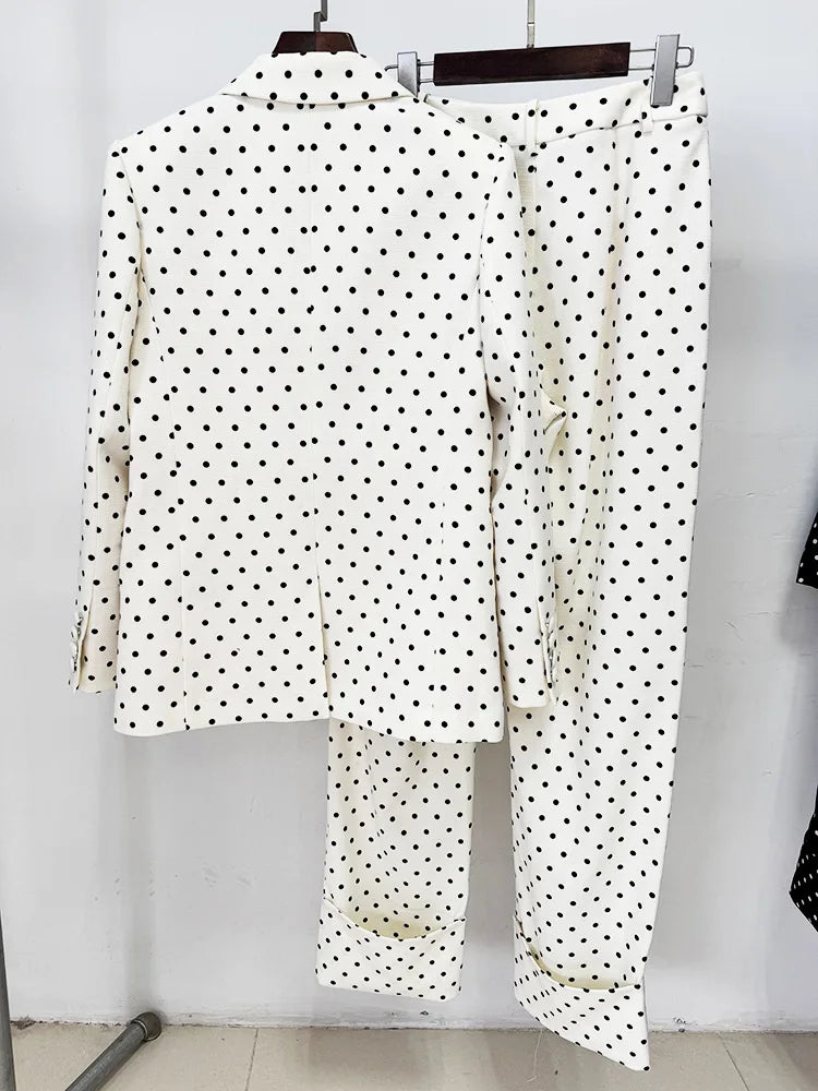 O Conjunto Valentina é um tributo à elegância divertida. Em alfaiataria estruturada, une blazer acinturado e calça de cintura alta com estampa clássica de poás. O detalhe do laço vermelho dá o contraste perfeito entre sofisticação e ousadia, trazendo frescor fashionista a um look atemporal. Uma escolha ideal para ocasiões em que estilo e presença precisam caminhar juntos.