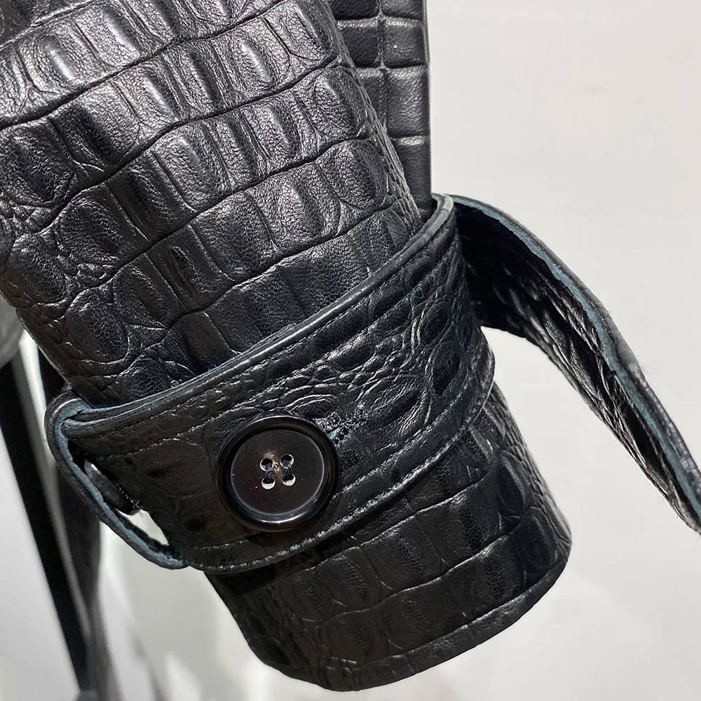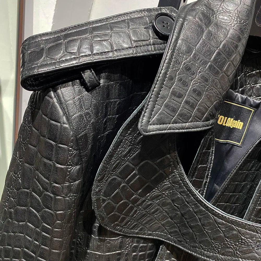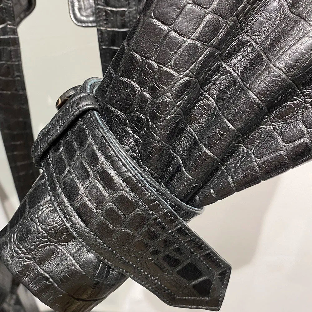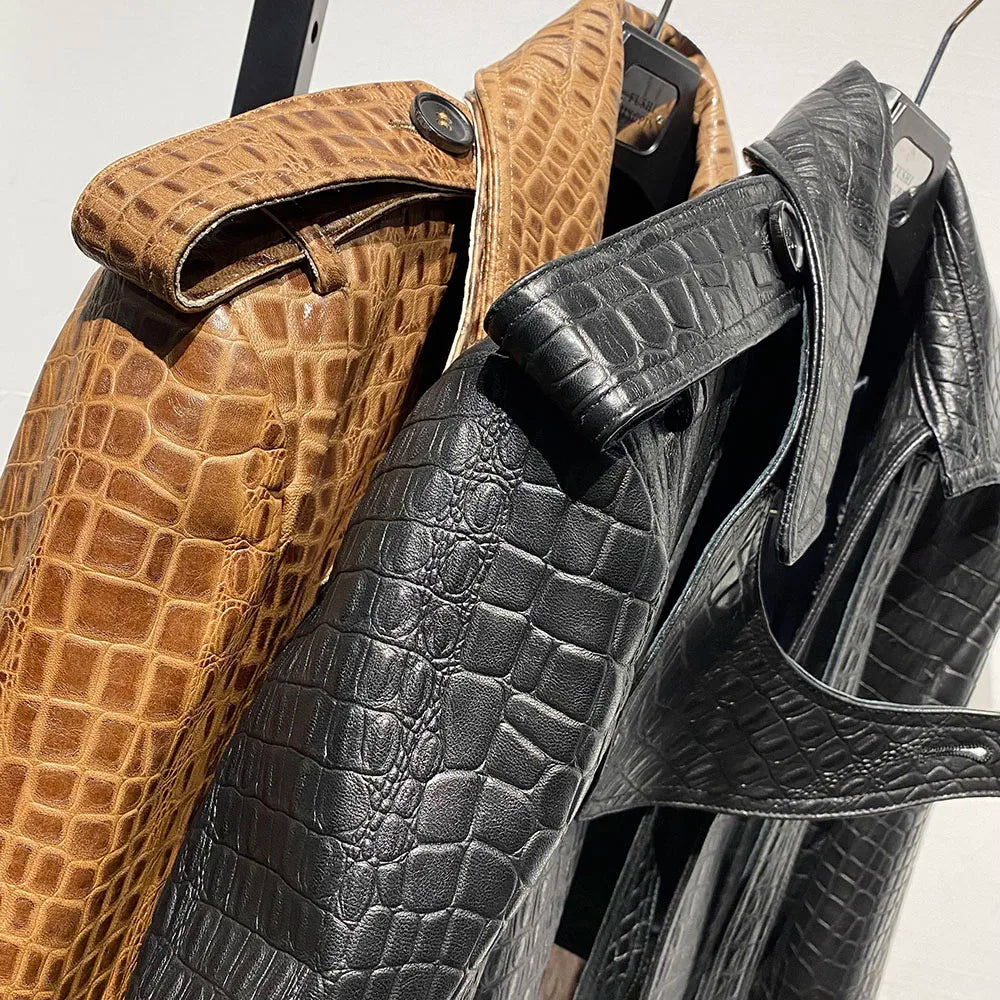 Unindo a rebeldia do streetwear de luxo com a elegância da textura crocodile, esta jaqueta é uma verdadeira escultura em forma de moda.