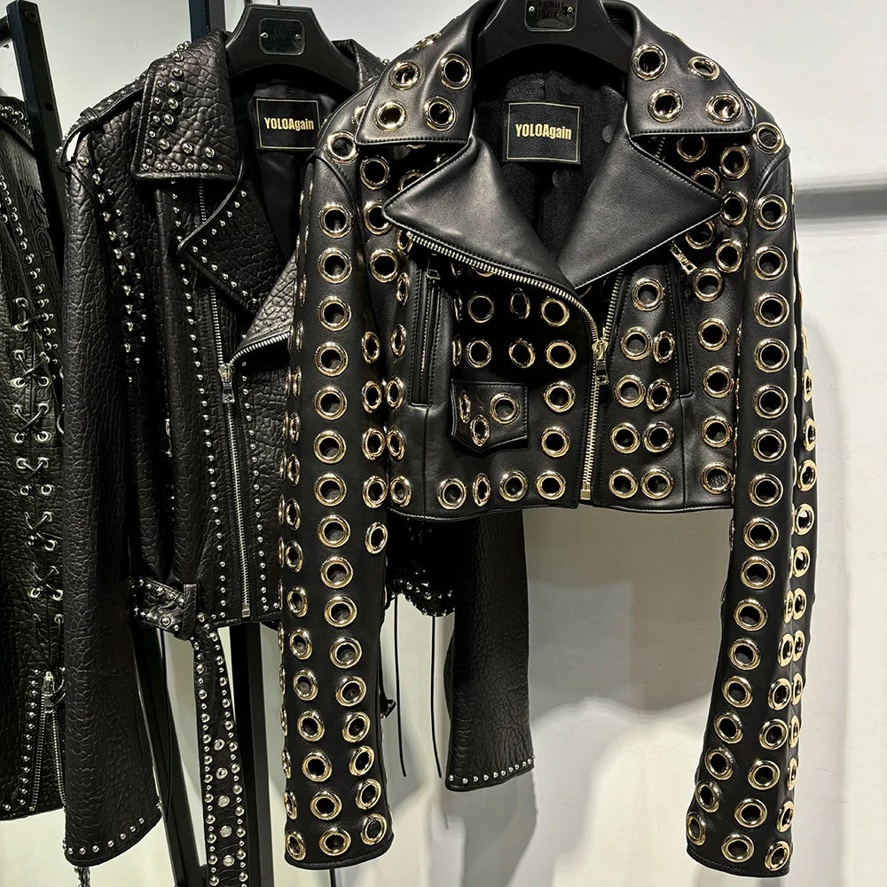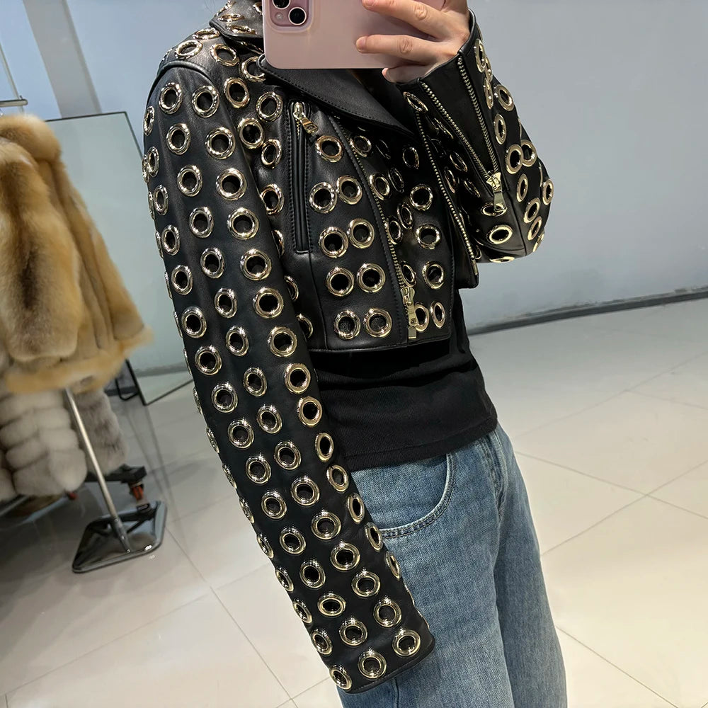 Não é apenas uma jaqueta, é uma obra de arte em couro. A Jaqueta Biker Cropped Eyelet Luxe redefine o conceito de atitude e sofisticação. Com um design arrojado e inteiramente adornado por ilhoses metálicos vazados, esta peça é a tradução do estilo "rocker chic" das passarelas internacionais diretamente para o seu visual.