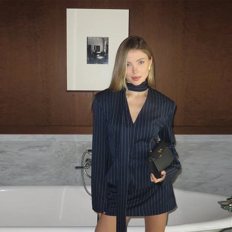 Composto por blazer acinturado, mini saia e echarpe coordenada, destaca-se pelo tecido listrado em azul profundo, que valoriza a silhueta com elegância e imponência. Ideal para ocasiões especiais e produções que pedem presença marcante com toque contemporâneo.
